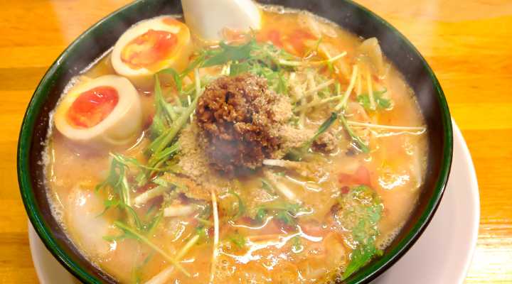 半熟卵や温泉卵をのせると、スープに溶けて味がマイルドになります。