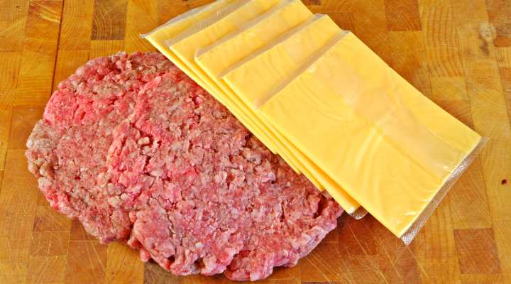 まず、肉だねを半分に分け、ラップの上で同じ厚さの円盤を2枚作ります。