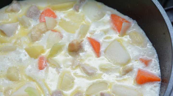 クリームシチューの場合、乳製品を早く入れすぎると分離の原因になります。